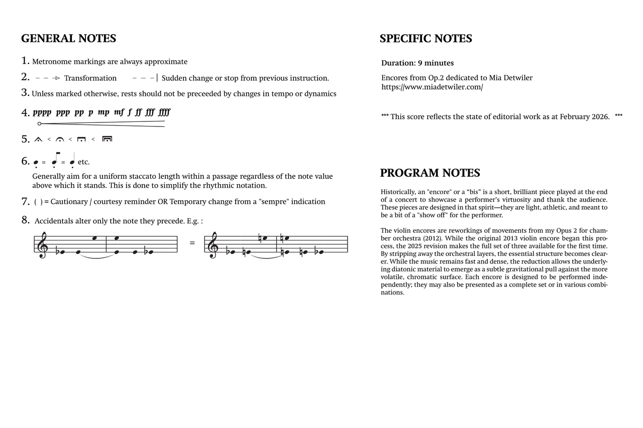 The violin encores are reworkings of movements from my Opus 2 for chamber orchestra (2012). While the original 2013 violin encore began this process, the 2025 revision makes the full set of three available for the first time. By stripping away the orchestral layers, the essential structure becomes clearer. While the music remains fast and dense, the reduction allows the underlying diatonic material to emerge as a subtle gravitational pull against the more volatile, chromatic surface. Each encore is designed to be performed independently; they may also be presented as a complete set or in various combinations.