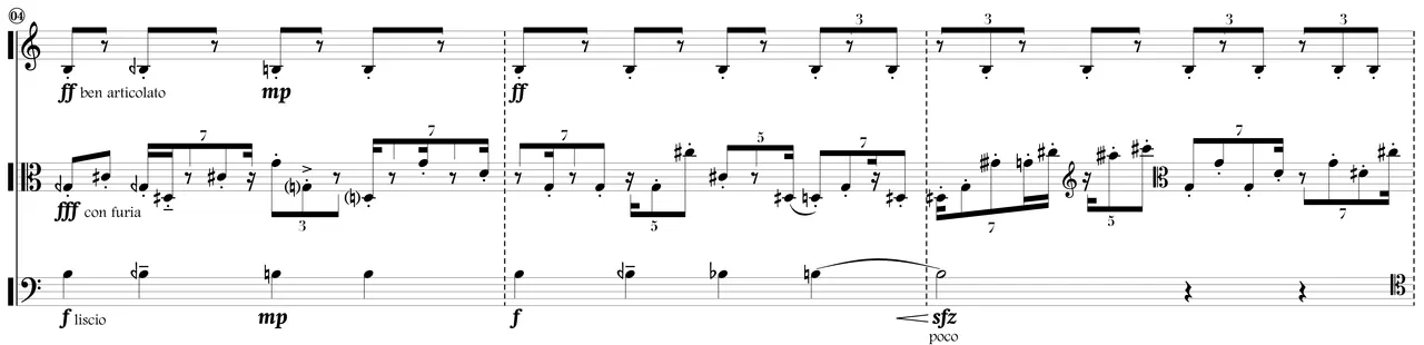 Op. 9 contends with processes whose underlying symmetries translate to distinctive musical and temporal gestures. The pervasive polyrhythmic hocketing and various “loop” repetitions and returns demarcate two of the most common groups of gestures. At the same time, there exists a related surface interaction among recognizable musical shapes, repeated melodic fragments, ostinati, preponderance of quarter-tone intervals, adaptation of local soundscape ecologies, and momentary allusions. Ultimately, their interaction highlights a desire for asymmetric and playful musical variations.